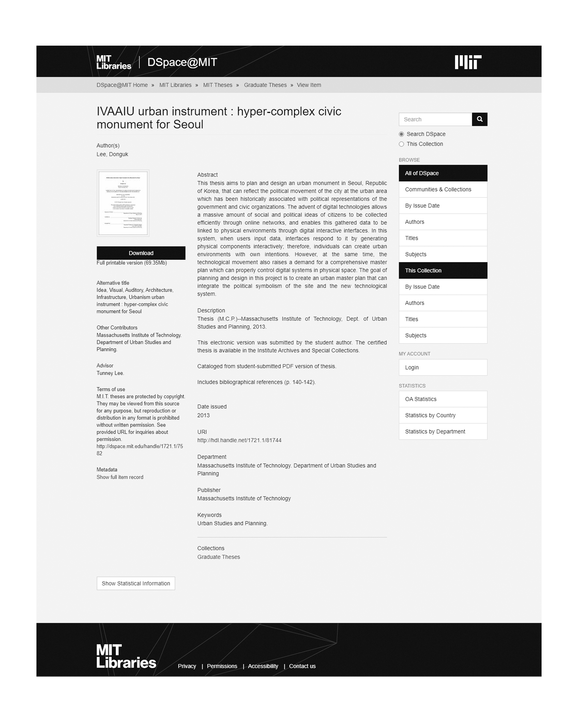 This thesis aims to plan and design an urban monument in Seoul, Republic of Korea, that can reflect the political movement of the city at the urban area which has been historically associated with political representations of the government and civic organizations. The advent of digital technologies allows a massive amount of social and political ideas of citizens to be collected efficiently through online networks, and enables this gathered data to be linked to physical environments through digital interactive interfaces. In this system, when users input data, interfaces respond to it by generating physical components interactively; therefore, individuals can create urban environments with own intentions. However, at the same time, the technological movement also raises a demand for a comprehensive master plan which can properly control digital systems in physical space. The goal of planning and design in this project is to create an urban master plan that can integrate the political symbolism of the site and the new technological system.